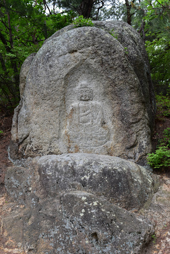 코멘트: 보리사 마애석불Rock-carved Buddha of Borisa Temple유형문화재Gyeongsangbuk-do Tangible Cuttural Heritage이 불상은 암벽에 돋을새김한 좌상이다. 앞으로 약간 기울어진 바위 면에 연잎 모양으로 알게 감실*을 파고 그 안에 불상을 새겼다.불상의 머리는 머리카락이 고불고불하게 말려 소라처럼 생긴 나발이다. 두 어깨를 덮고 있는 법의 사이로 가샴이 드러나 있고, 그 아래에 속옷의 윗단이 넓고 경사지게 표현되었다. 두 손은 아랫배 부근에서 옷자락 안으로 숨어 있다. 가부좌한 하체는 가운데로 향하는 웃의주름들로 두툼하게 표현되었다. 다리 아래에 얕게 음각된 연꽃잎은 연화대좌**로 보인다. 상체에 비해 하체의 폭이 좁아 다소 왜소한 느낌을 준다.불상의 온화한 얼굴 표정과 단정한 자세는 명상에 잠긴 부처의 자비심이 효과적으로 표현되었다. 이러한 기법으로 보아 통일 신라 시대의 불상임을 알수있다.*감실: 불교:유교:가톨릭 등의 종교에서 신위나 작은 불상 조각 등을 모셔 두는 곳** 연화대좌: 부처를 모시는 자리를 연꽃의 모양으로 조각을 하기 때문에 연화좌, 흑은 연화대좌라고 한다.주차장에서 왼쪽으로 산책길로 올라가면 간판에서 오른쪽으로 산쪽으로 올라가면 조그만 바위에 웃음이 가득한 부처님이 계십니다. (2024.4월 기준)