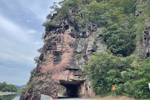 코멘트: 측백나무는 흔히 볼 수 있는 나무다. 열매가 별을 닮았다. 길에서 흔히 볼 수 있는 측백나무가 벼랑에 아슬아슬하게 매달려 있다. 안동 구리측백나무숲은 그렇다.거의 90도에 가까운 아찔한 경사면이다. 여기에 아슬아슬하게 매달려 있다. 오로지 돌 뿐인 벼랑에 나무가 뿌리를 내린 게 신기할 따름이다. 힘든 환경이어서인지 측백나무는 작고 낮다. 하지만 나무 한그루 한그루 모여 숲을 이룬 풍경은 숭고함마저 들게 한다.측백나무는 흔하지만 자생지는 매우 드물다. 대구, 영천, 영양, 안동 정도에 불과하다. 자생지는 대부분 천연기념물로 지정돼 있다. 안동 측백나무숲은 천연기념물 252호다.숲 아래 굴은 일제시대 때 만들었다. 안동-대구간 국도로 사용됐다.바로 근처가 암산유원지다. 겨울에 얼음썰매장으로 유명한 곳이다.