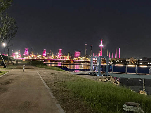 : 포항운하박물관은 총 3개 코스가 시간과 가격이 다르고 3D그림도 있어요 2층은 매표소, 3~4층은 카페 계단 산책로를 따라 강 사진을 찍을 수 있어요 , 정말 아름답습니다. 반대편에는 한국 최대 철강 회사인 포스코가 있습니다.