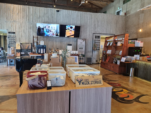 코멘트: 미곡창고를 개조해 만든 카페다운 인테리어가 인상적입니다. 천고가 높아서 실내지만 답답하지 않아 좋아요. 홀에는 통나무로 된 긴 테이블이 여럿 있는데 차 마시며 이야기 하기도, 책 읽기도 좋았어요. 커피도 괜찮았고, 베이커리도 맛있다고 들었는데 배가 불러서 못 시켜 아쉬웠어요ㅠㅠ 카페 한켠에 갤러리를 운영 중이고 2층 좌석도 넉넉했습니다. 화장실은 남여 따로 있는데 깨끗했고 화장실 인테리어도 인상적이었습니다만 남자화장실 소리가 들려서 좀 신경 쓰였어요ㅠㅠ