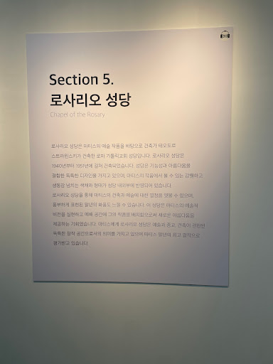 : 앙리 마티스 후기 작품 전시전. 몸의 약화로 유화물감을 더이상 사용 못하게 된후 cut out 방식의새로운 작품들 전시.끊임없이 작품에 대한 열정이 존경스럽다