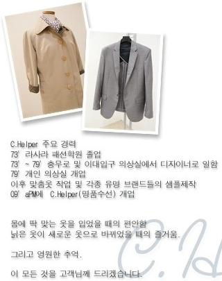 이름: �** 날짜: 2020-05-27 09:42:12 코멘트: 5 코멘트: 방문고객의 설명을 다 들으신 이후에 추가로 필요한 부분등을 설명하시어 좀더 나은 옷을 만들어 주시는 분입니다..워낙 오랜시간 작업을 하신분이라.. 따로 설명이 필요없지만 옷에 맞는 실(색깔)을 찾으시느라 작업 시간이 길어집니다